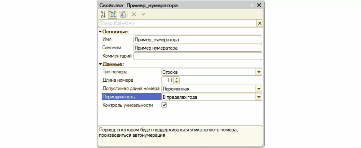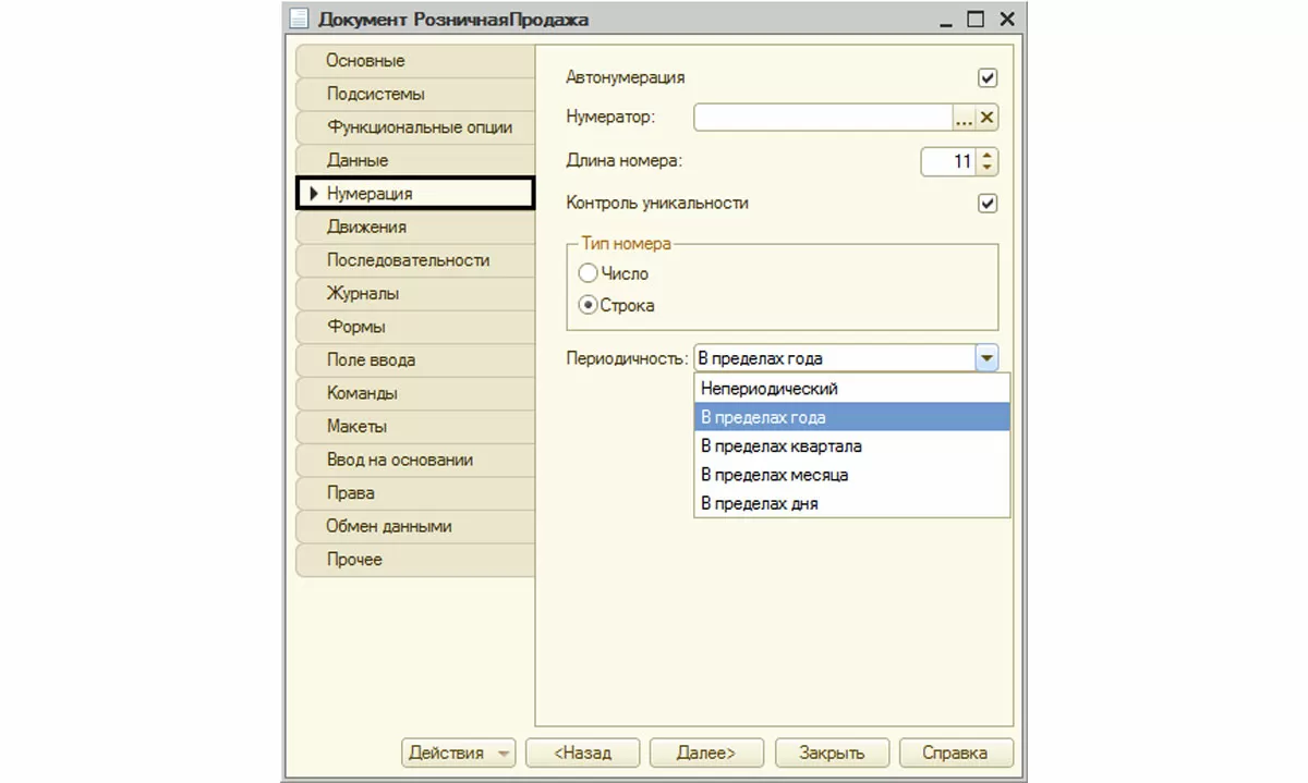 - Периодичность. В этом поле задается период, в пределах которого проверяется уникальность номера документа. Чаще период задается год. Но разработчиком может быть задана периодичность квартал, месяц, день. Установка периода, например, в месяц приведет к тому, что по истечению месяца нумерация документов опять начнется с начала, то есть с номера 1.