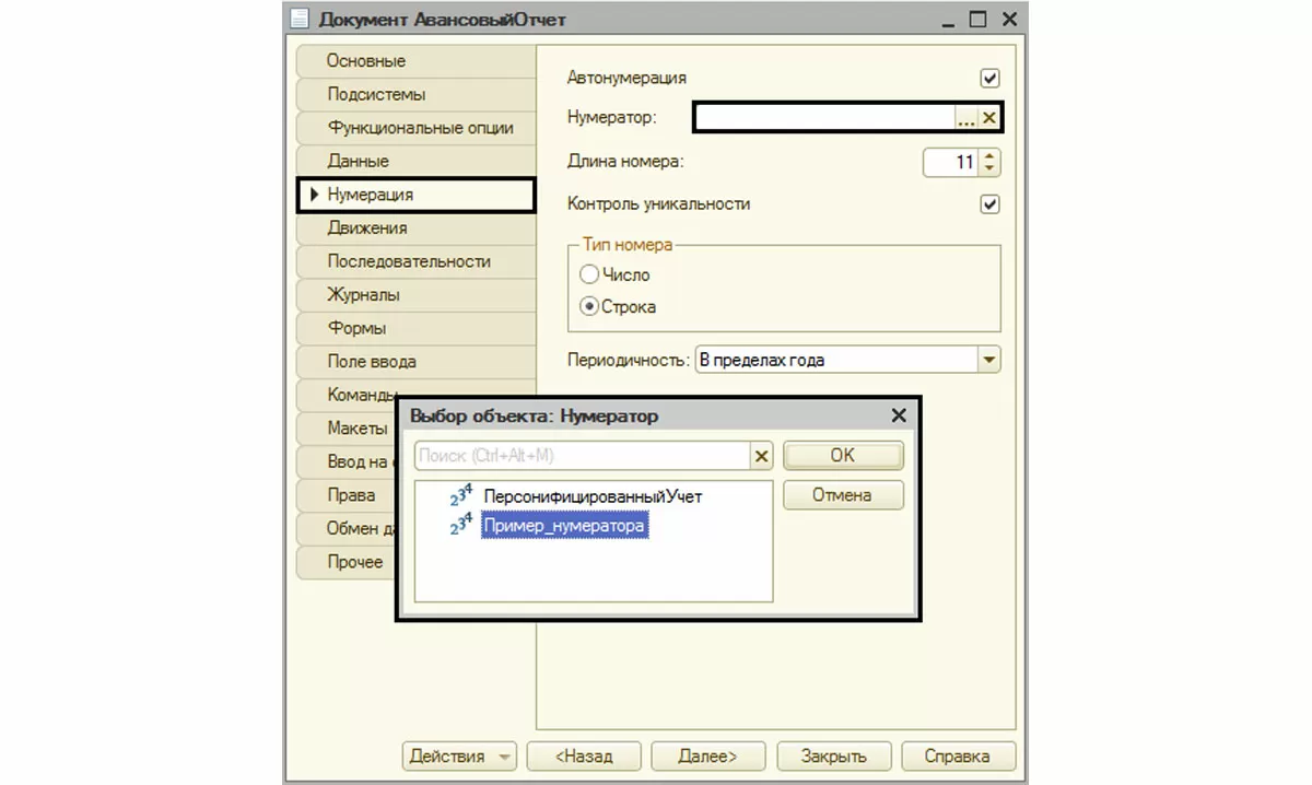 Создав свой нумератор, мы можем его указать в настройках документа. Для тех документов, где он указан в качестве нумератора, будут использоваться его свойства нумерации и нумерация для этих документов будет сквозная.