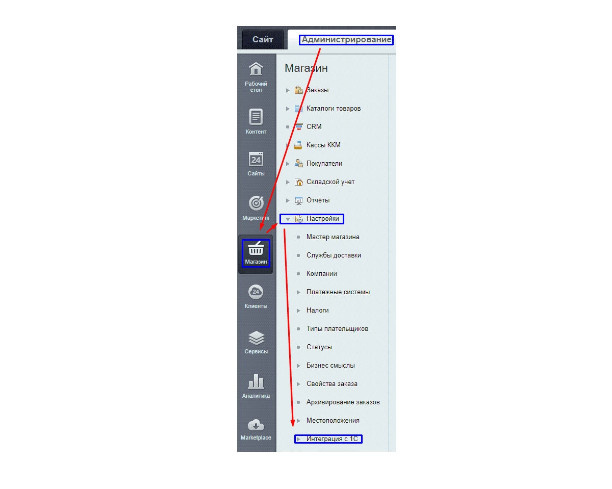 Открываем меню «Интеграция с 1С», которое находится в разделе «Магазин-Настройки».