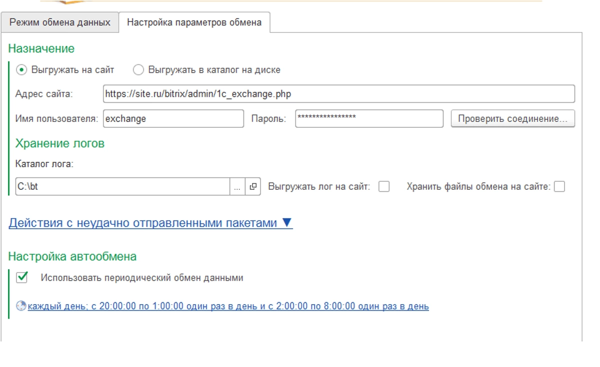 Здесь же можно настроить автоматическую синхронизацию между 1С-Битрикс и 1С, задав удобные временные рамки.