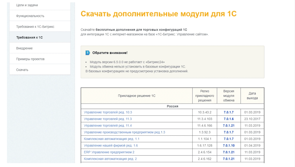 Скачаем модуль интеграции с 1С, выбрав соответствующий продукт из списка.