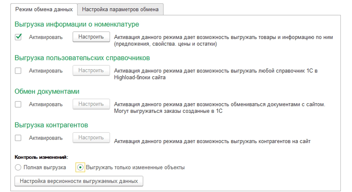 Настройка модуля обмена позволяет синхронизировать следующие данные: