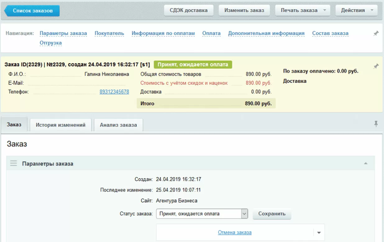 После этого можно выполнять обмен заказами и, если все было настроено правильно, в 1С-Битрикс начнут отображаться данные из 1С.