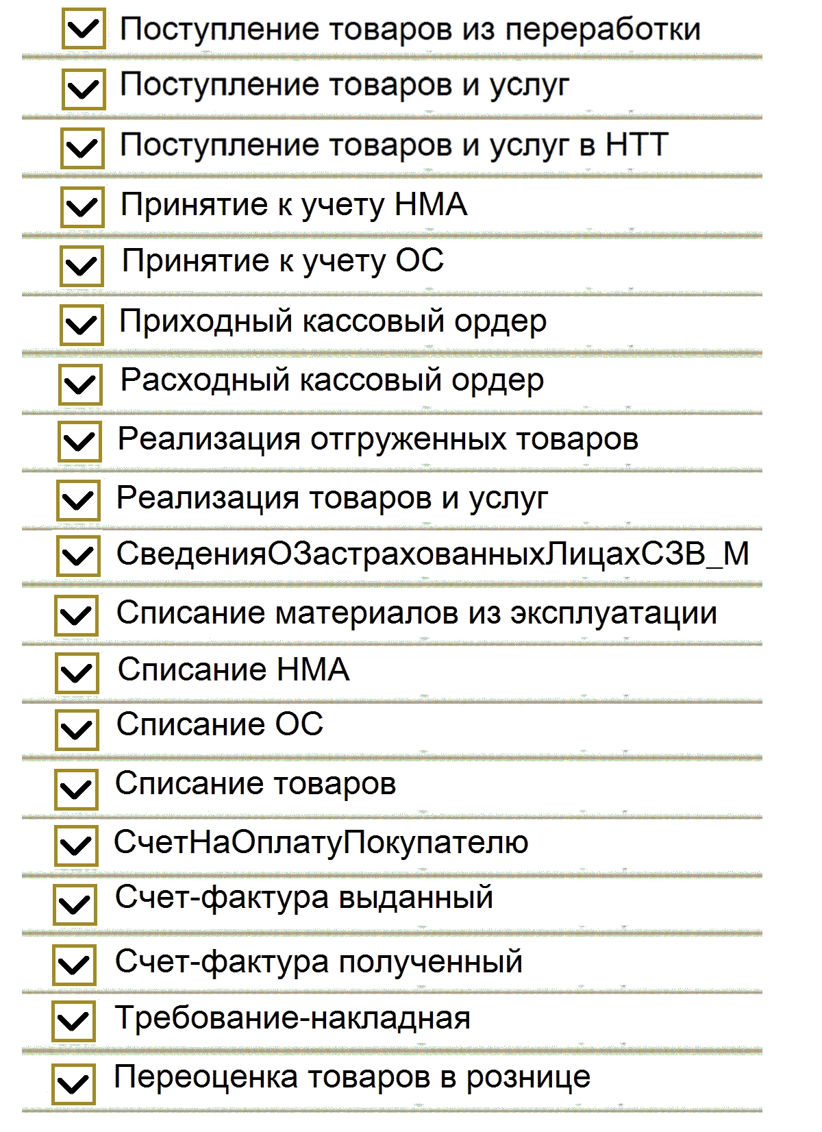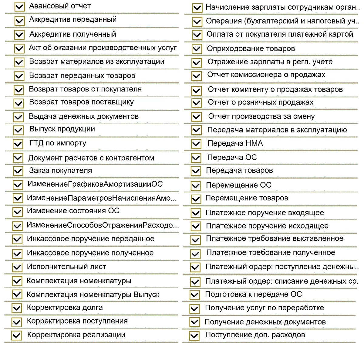 Перечень достаточно большой. Бухгалтерские операции вместе с проводками переносятся документом «Операция (бухгалтерский и налоговый учет)».