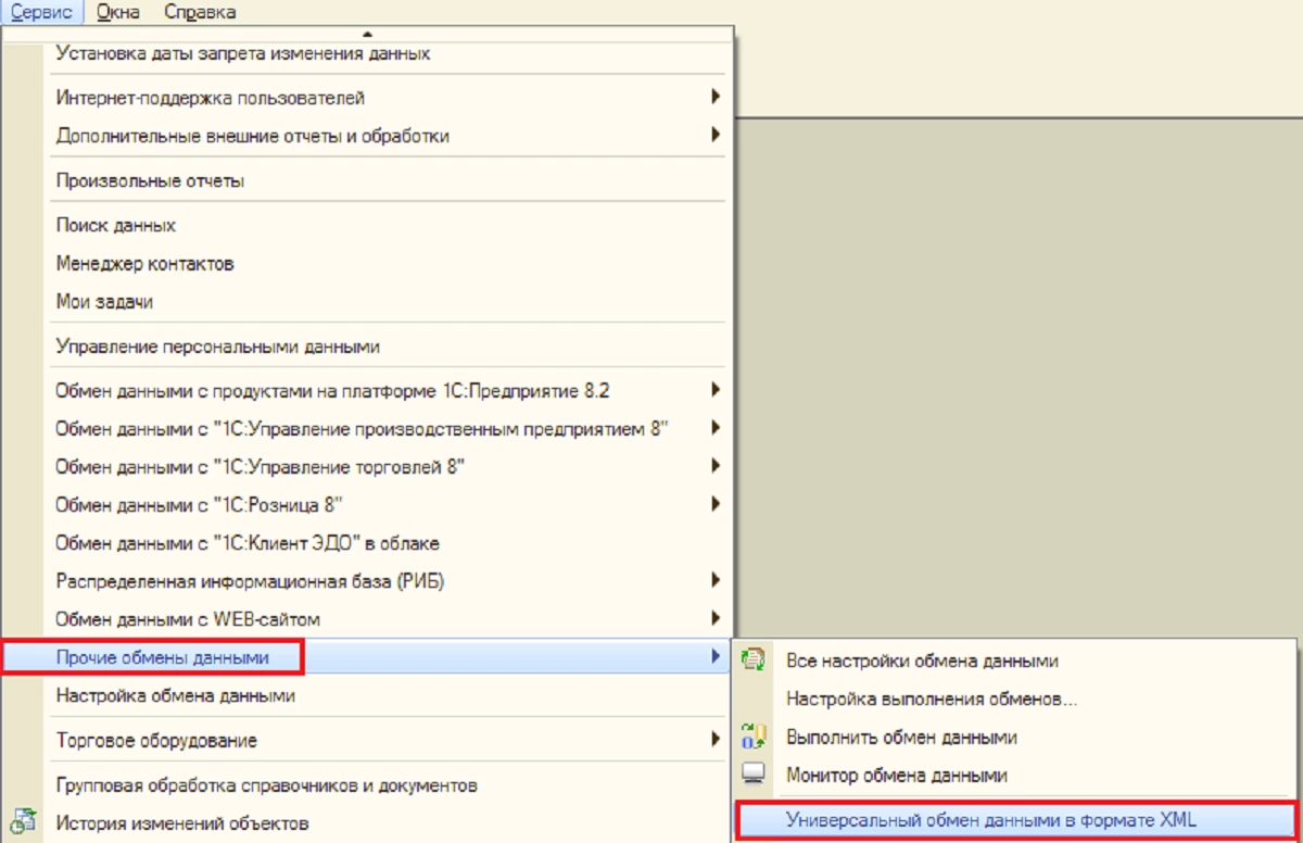 Шаг 1. Как уже говорилось выше, перенести ИБ можно путем выгрузки-загрузки учетных данных через промежуточный файл, посредством внешней обработки. Второй вариант переноса – подключение и выгрузка в ИБ-приемник (так часто делают и это имеет свои преимущества). Мы рассмотрим первый вариант. Обработку запускают из меню «Сервис-Прочие обмены данными».
