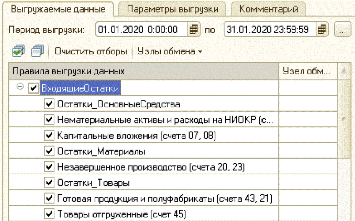 Перенесем данные любого формата между программами 1СШаг 2. Перенесем в БП остатки на начало периода таким же способом, как и на предыдущем шаге. В дереве правил для группы «Входящие остатки» поставьте необходимые флажки и нажмите «Выгрузить данные».