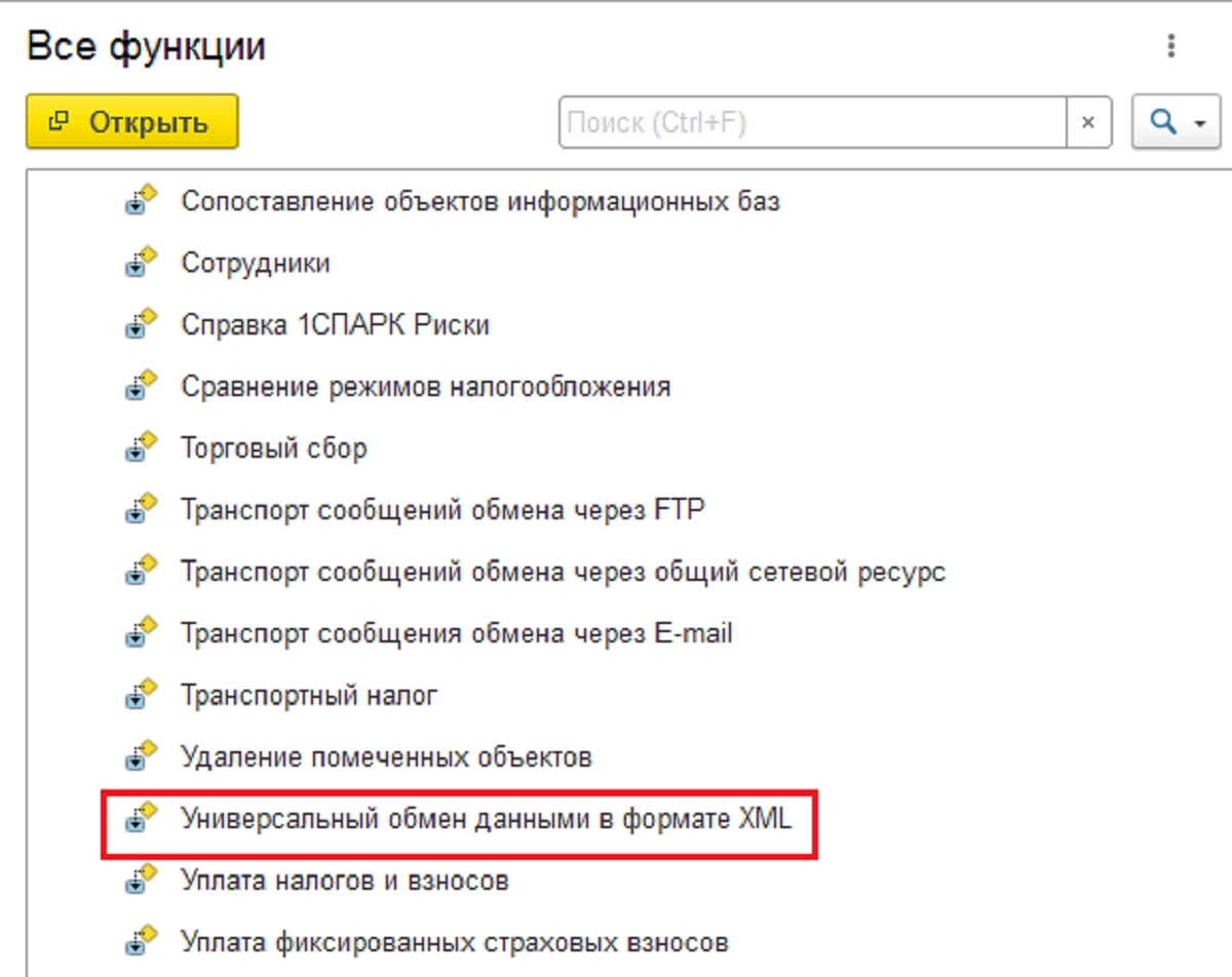 Теперь этот файл надо загрузить в конфигурацию-приемник. Загрузку в БП 3.0 производят также обработкой для универсального обмена, открыть ее можно из меню «Все функции».