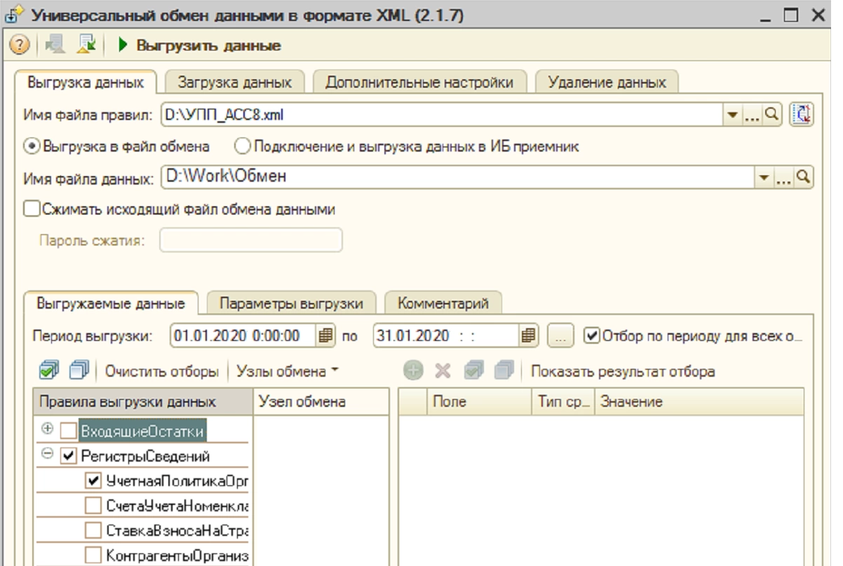 Здесь переходим на «Выгрузку данных» и указываем «Имя файла правил» – УПП_АСС8.xml.