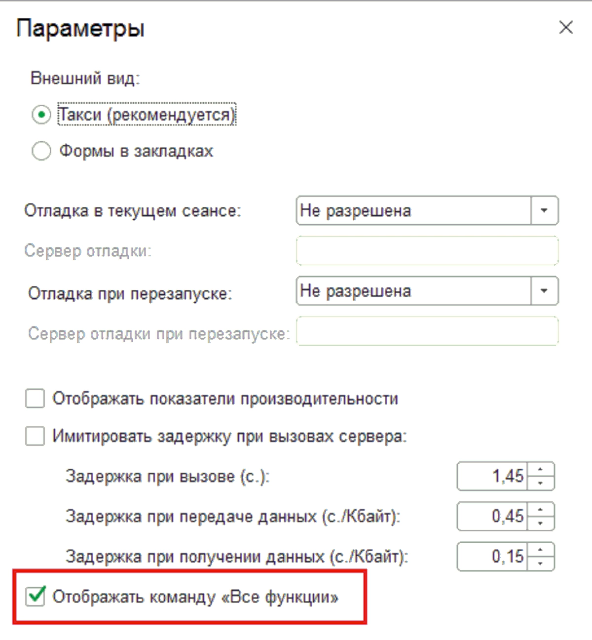 Когда этого пункта меню в базе нет, его добавляют через «Сервис-Параметры» установкой флага «Отображать команду «Все функции».