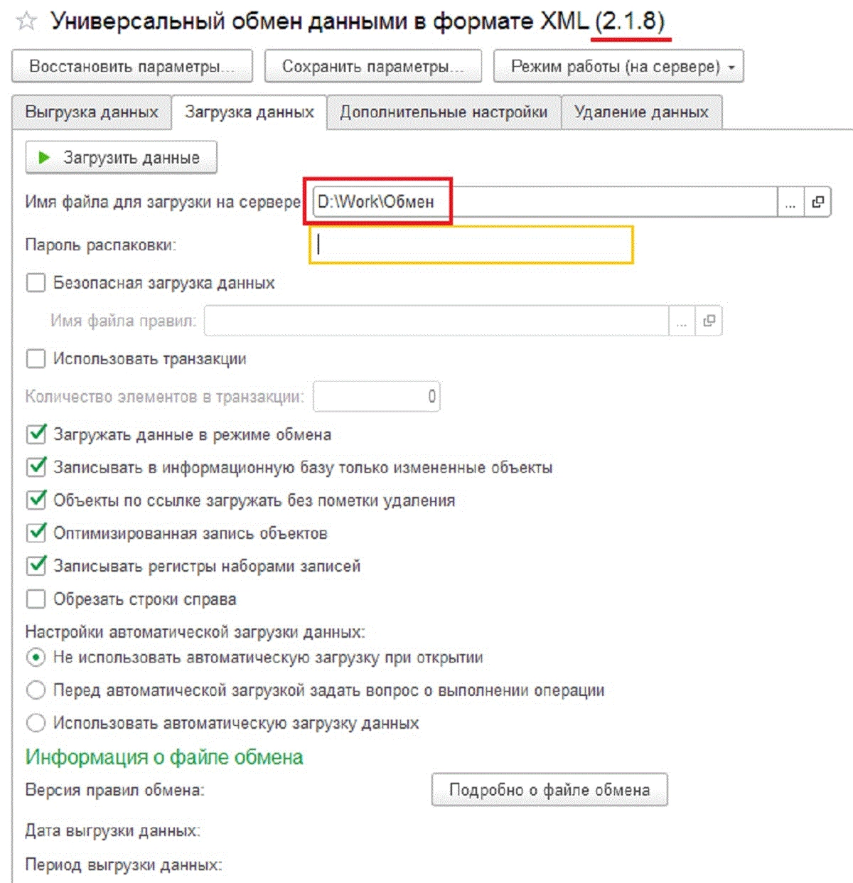 Перейдите на «Загрузку данных», где укажите тот же файл, что использовали при выгрузке (на Рис.4 D:\Work\Обмен.xml), и выполните процедуру по кнопке «Загрузить данные».