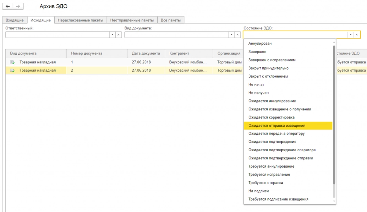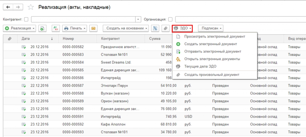 Также учите, что в системе электронного документооборота для некоторых статусов ЭДО требуется повторная отправка документов. Создать пакет документов вы можете из любой формы списка документов, используя кнопку «ЭДО».
