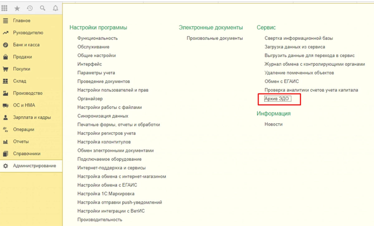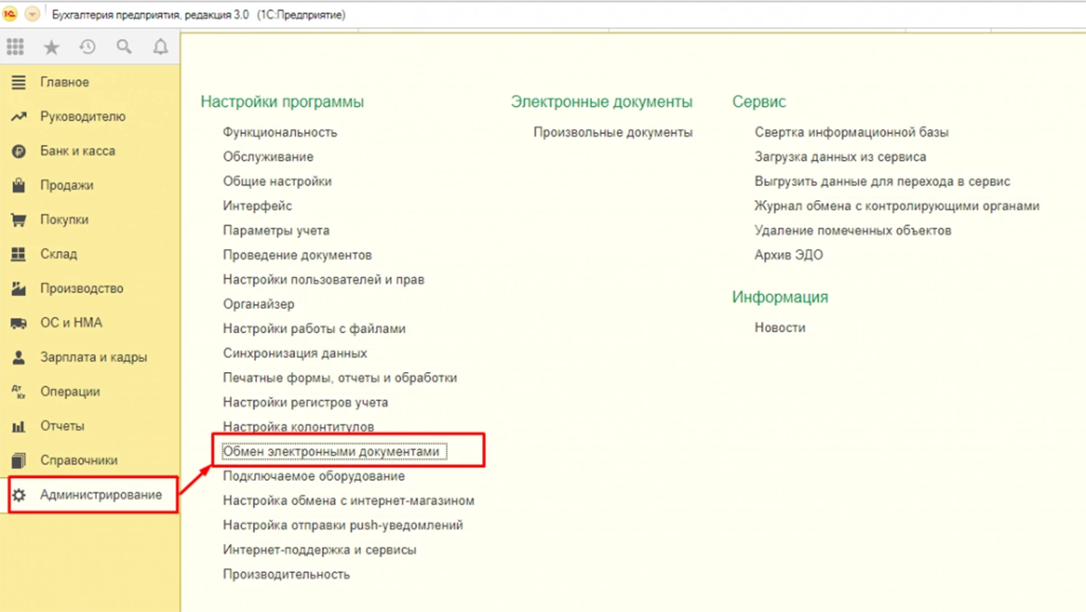 Чтобы активировать возможность подключения к электронному документообороту, иметь возможность отправить и принять документы по ЭДО, необходимо зайти в раздел «Администрирование-Обмен электронными документами».