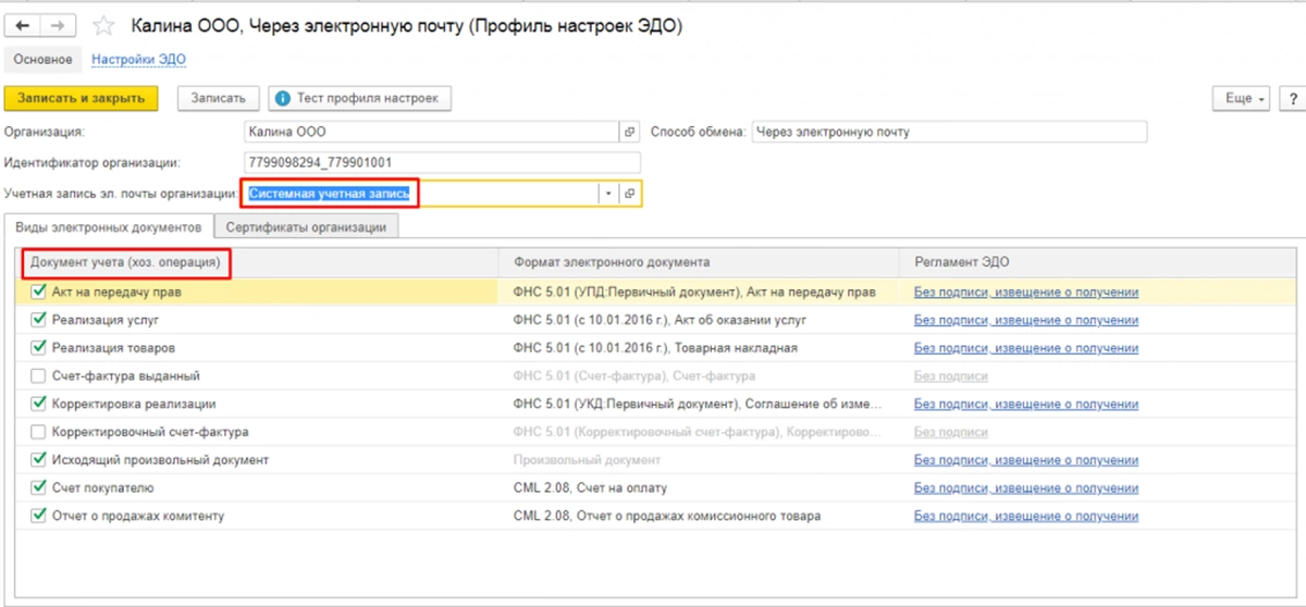 Далее мы работаем в окне настройки профиля ЭДО через почту. Для 1С-ЭДО 8.3 нужно выделить отдельную учетную почтовую запись, с которой будут отправляться документы и на которую они будут возвращаться от контрагента. Также в профиле необходимо флагами выделить типы документов, которые будут участвовать в обмене.