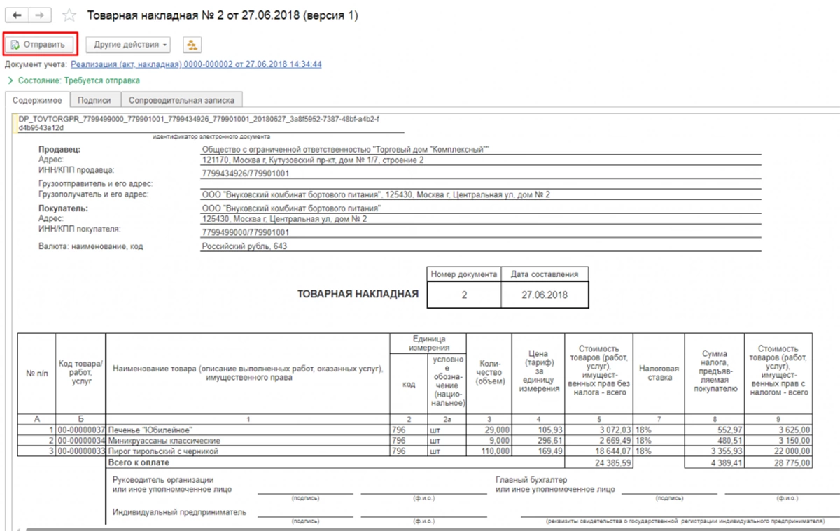 Созданный электронный документ можно просмотреть, а также отправить его способом, выбранным в настройках профиля – с помощью сервисов, то есть через оператора, или через прямой обмен контрагенту.