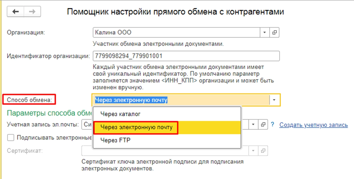 Подключение к прямому обмену потребует указать в помощнике организацию и ее идентификатор, который заполняется автоматом на основании ИНН организации и ее КПП. В качестве способа обмена можно указать обмен через каталог с общим доступом, обмен по электронной почте или с помощью FTP-каталога.