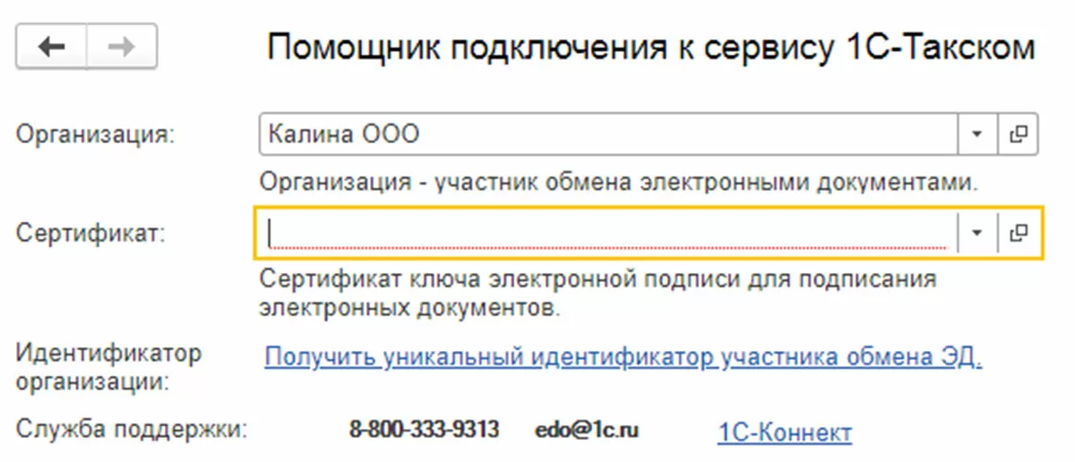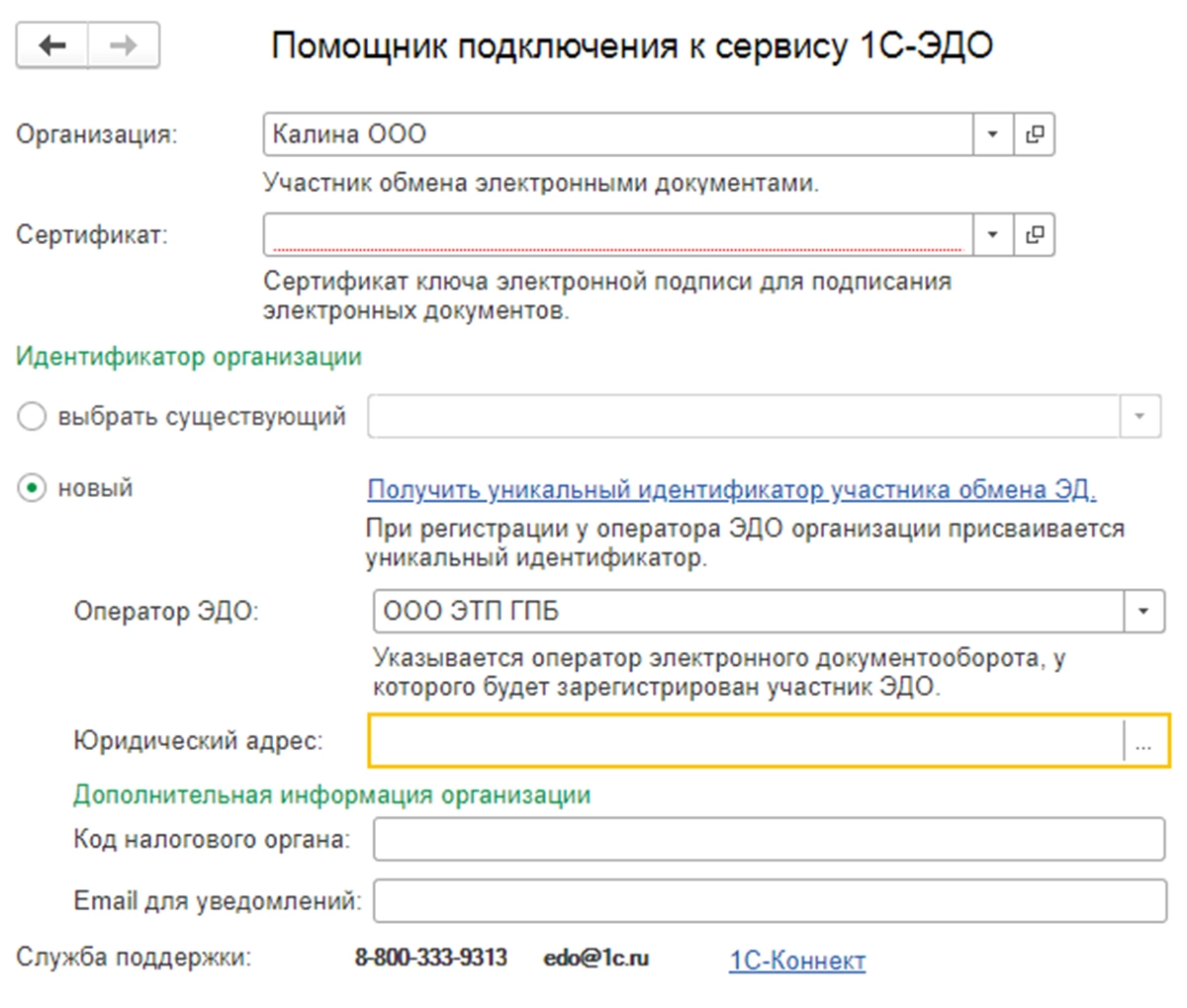 При настройке подключения к сервису открывается окно мастера настроек. Заполняем все имеющиеся поля для корректной работы ЭДО.