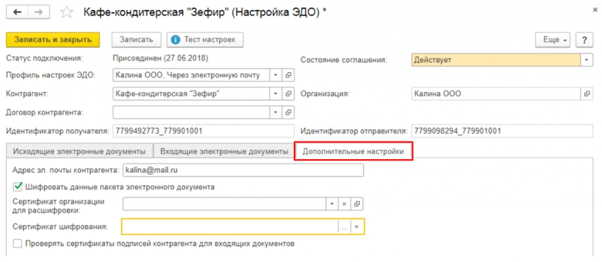 На вкладке «Дополнительные настройки» указывается адрес почты контрагента, куда будут уходить исходящие документы. При необходимости защиты документов следует установить флаг «Шифровать данные пакета электронного документа», а также выбрать сертификаты для шифрования и расшифровки. Установленный флаг «Проверять сертификаты подписей контрагента для входящих документов» потребует загрузки из файла соответствующего сертификата.
