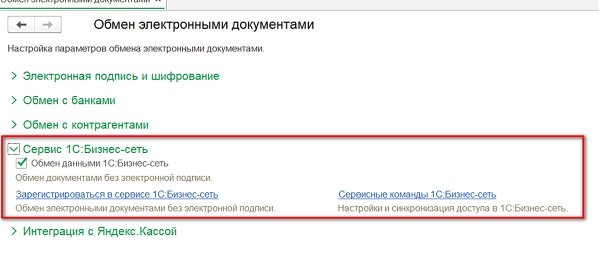 Для подключения к нему нужна действующая подписка 1С:ИТС, так как взаимодействие происходит через механизмы 1С. Регистрация также происходит через программу 1С, откуда и возникает одно из преимуществ данного сервиса – работа без цифровой подписи (что накладывает определенные ограничения на список документов к обмену). На данный момент доступен обмен следующими документами: