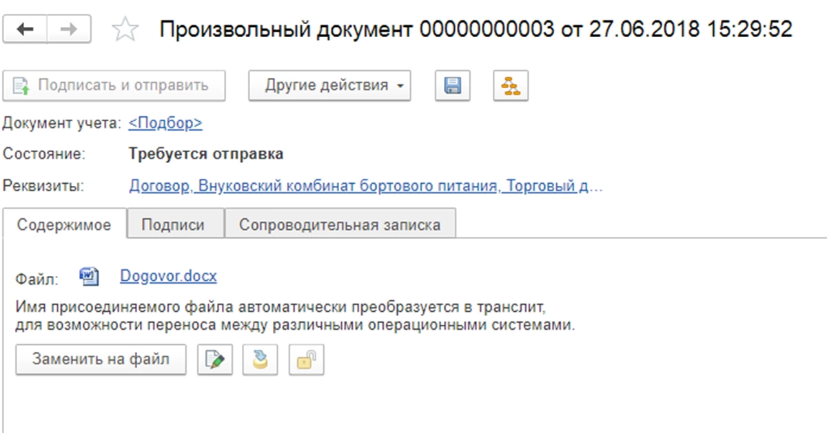 Из открывшейся формы можно сразу отправить сформированный документ. В этой же форме можно просмотреть подписи и составить сопроводительную записку. Полный список документов можно открыть через раздел «Администрирование-Архив ЭДО».