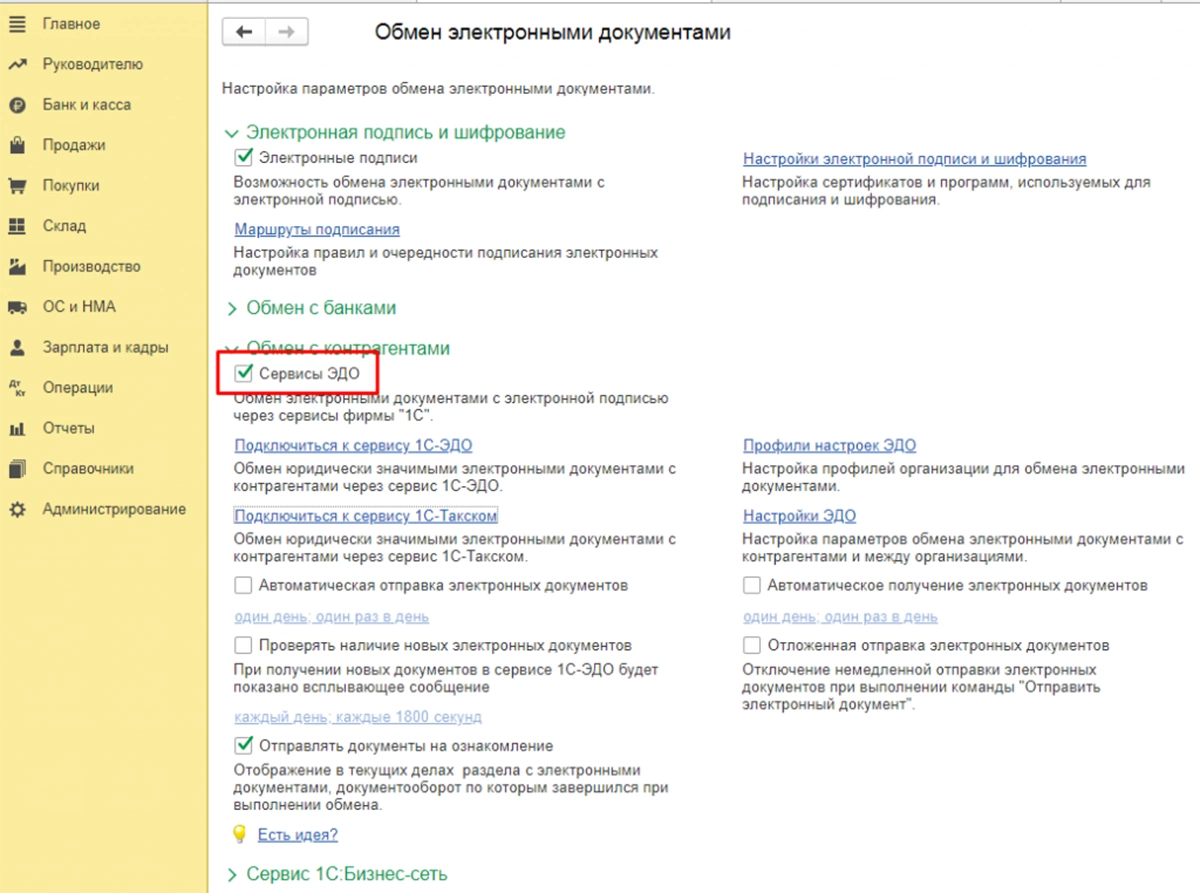 Отметим Сервисы ЭДО. Основные сервисы, предусмотренные в стандартной конфигурации – 1С-ЭДО и 1С-Такском.