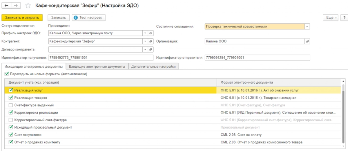 После выбора контрагента открывается настройка ЭДО с ним. Из настройки профиля переносятся данные об организации, ее идентификатор, список документов, участвующих в электронном документообороте, и их формат. Автоматически формируется идентификатор контрагента. Договор контрагента заполняется только в том случае, когда для данного контрагента будут использоваться более одного идентификатора.