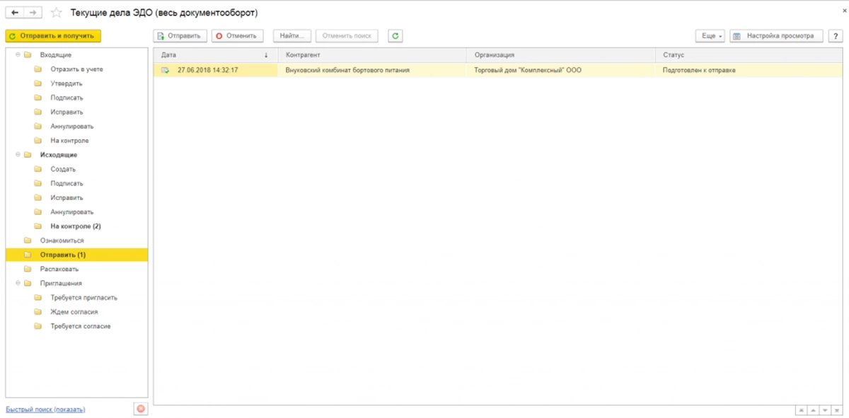После включения опций и выполнения настроек в базе появляются новые кнопки по работе с ЭДО.