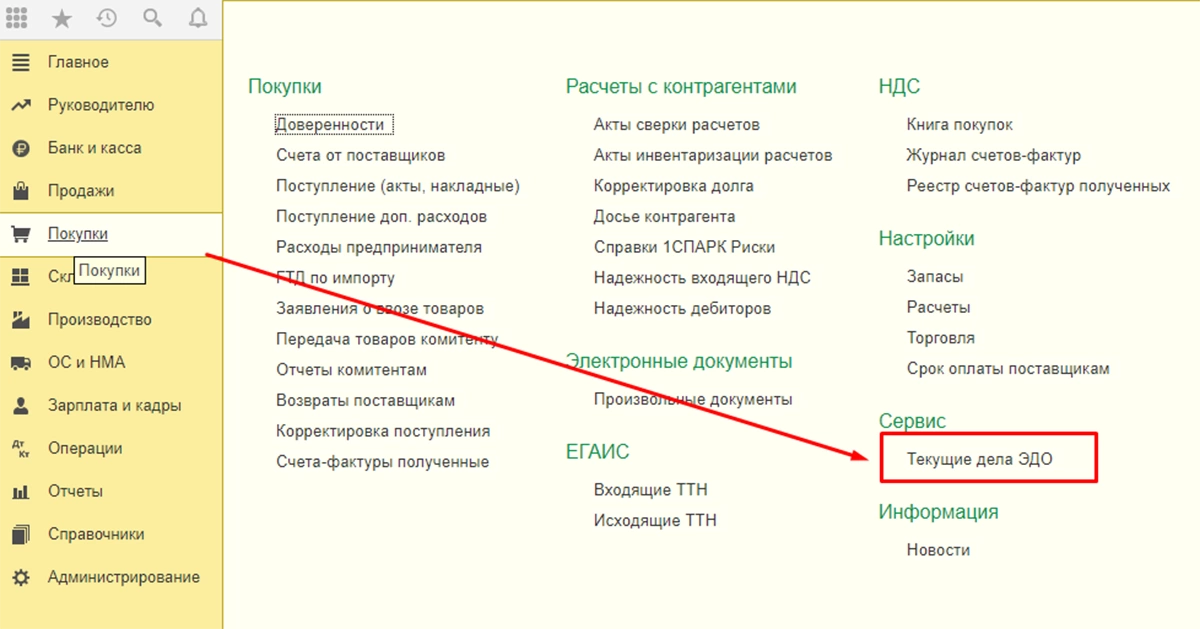 Для текущей работы, получения или отправки электронных документов нужно зайти в «Текущие дела ЭДО» непосредственно из панели кнопок работы с ЭДО в списках документов или через раздел «Продажи или покупки».