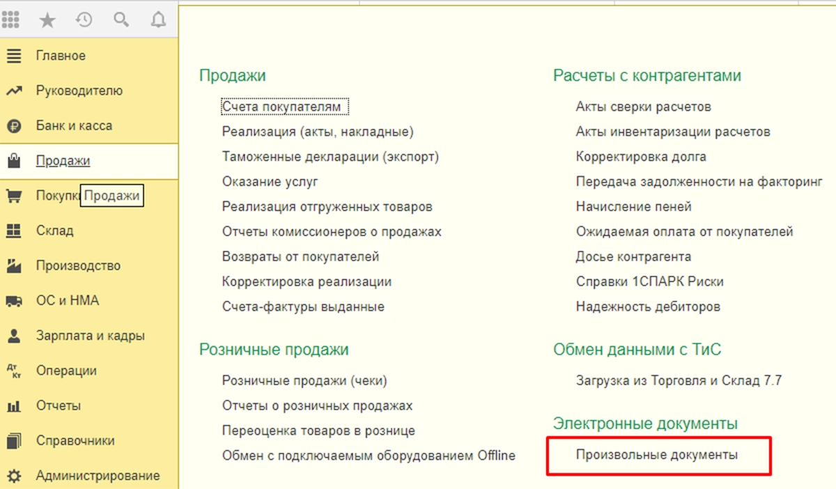 В системе, кроме типовых электронных документов, можно сформировать произвольные. Сделать это можно через меню «Продажи/Покупки-Произвольные документы».