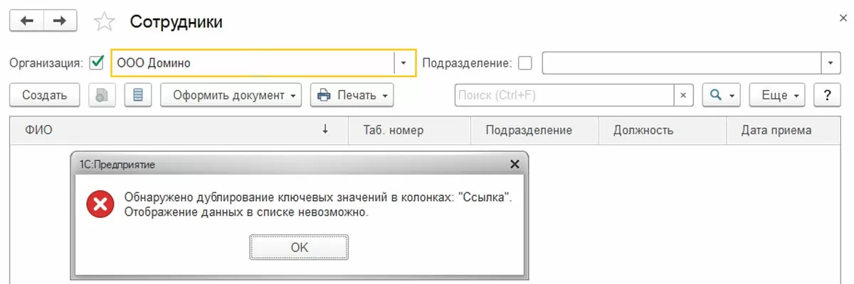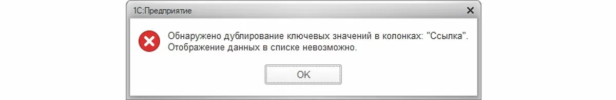 Она может возникнуть при работе в режиме управляемого приложения, при открытии формы выбора, списка или установлении отбора в такой форме. Т.е. программа использует запрос в динамическом списке, а при переносе из-за сбоя программы могут появиться дублирующие строки, т.е. в списке будут содержаться одинаковые ссылки на справочник или регистр. Например, при установлении отбора в справочнике «Сотрудники». В результате и появляется такого рода ошибка.