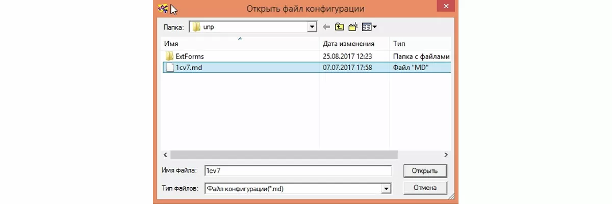 Программа попросит указать путь к файлу обновления. Указываем путь к папке unp, в которую мы распаковали файлы обновления. Выбираем файл 1Сv7.md и жмем «Открыть».