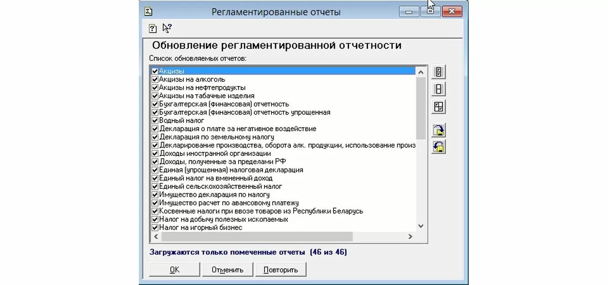 В появившемся окне видим список обновляемых отчетов. Можно выбрать все или пометить галочками только необходимые. Нажимаем «ОК».