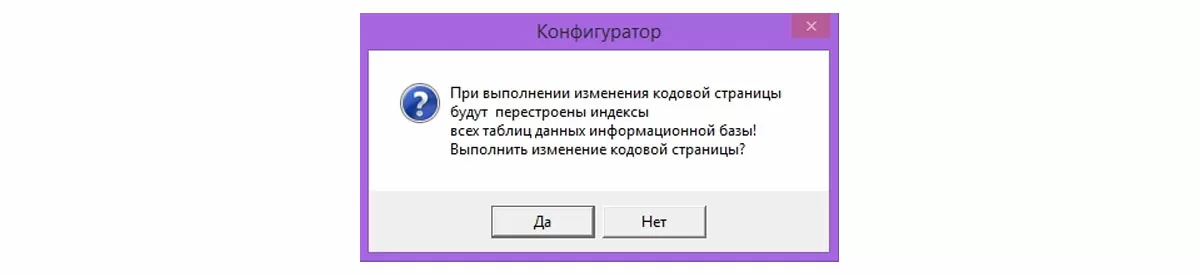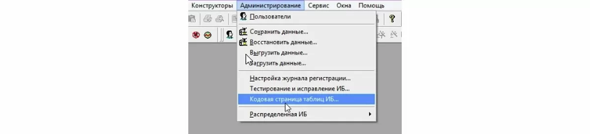 Для ее устранения возвращаемся в конфигуратор. «Администрирование» — «Кодовая страница таблиц ИБ».