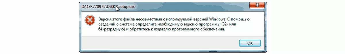 Заходим в папку [Disk 1] и запускаем файл 1С «Setup.exe». И тут нас ожидает разочарование. В зависимости от версии Windows, которая у нас установлена, мы увидим следующее сообщение или ему подобное: