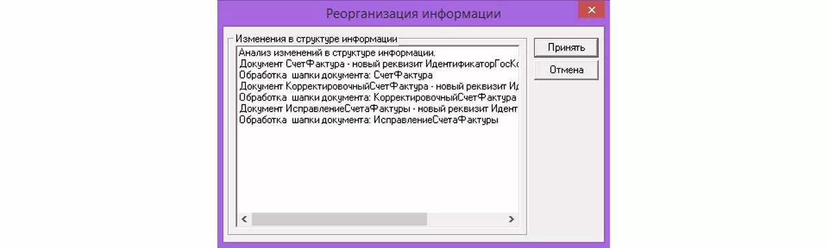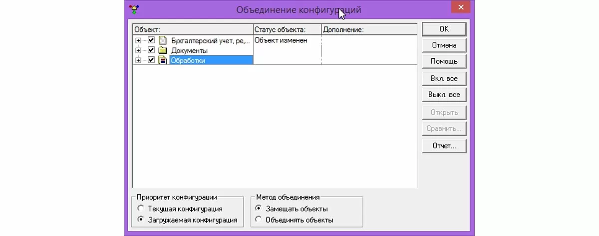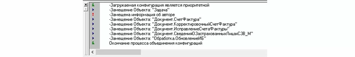 Программа проводит сравнение нашей конфигурации с новой конфигурацией поставщика и выдает следующее окно со списком изменений: