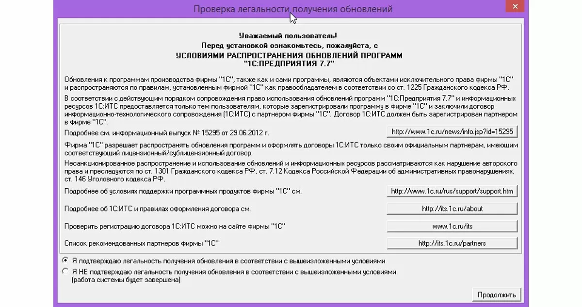 Чтобы установить последний релиз для начала нам понадобится дистрибутив обновления для 1С 7.7. Взять его можно на диске ИТС, у представителя обслуживающей компании или скачать на партнерском сайте 1С.