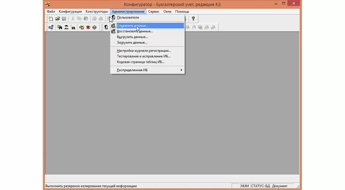 В конфигураторе делаем архивную копию базы, чтобы в случае ошибки при обновлении или какой-либо нештатной ситуации можно было нашу базу восстановить. Для создания архива в главном меню выбираем «Администрирование» — «Сохранить данные».