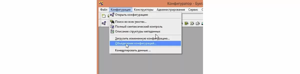 После этого заходим в меню «Конфигурация» — «Объединение конфигураций».