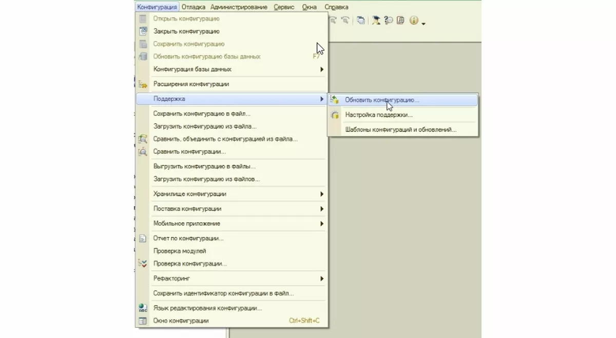 Опять заходим в меню «Конфигурация» - «Поддержка» - «Обновить конфигурацию».