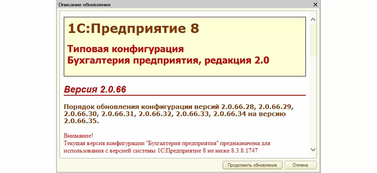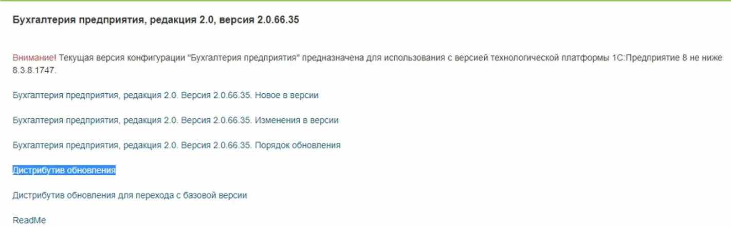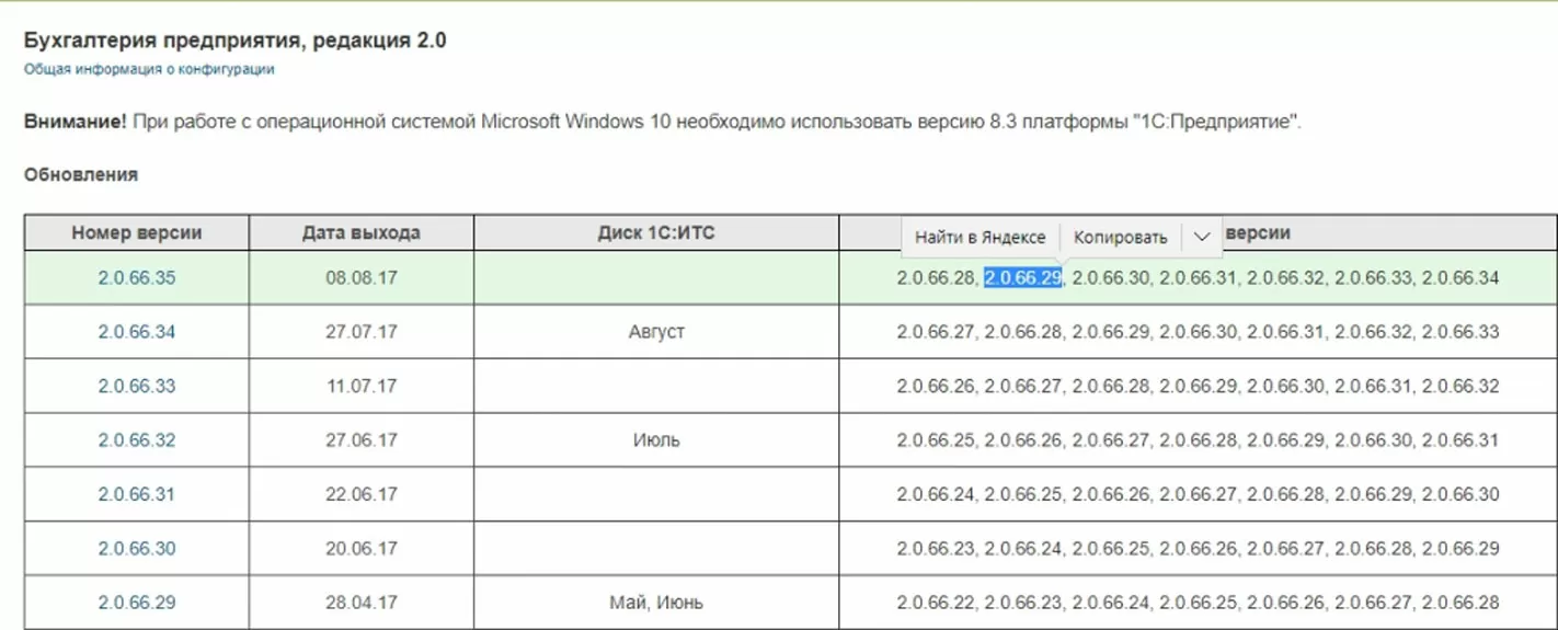Как мы помним, у нас Бухгалтерия предприятия релиза 2.0.66.29. В колонке «Обновление версии» мы видим релизы конфигурации, на которые можно установить обновление. Нам повезло. Последний на данный момент релиз конфигурации подходит для обновления с нашего релиза. Это значит, что мы можем обновиться сразу на него, минуя промежуточные версии.