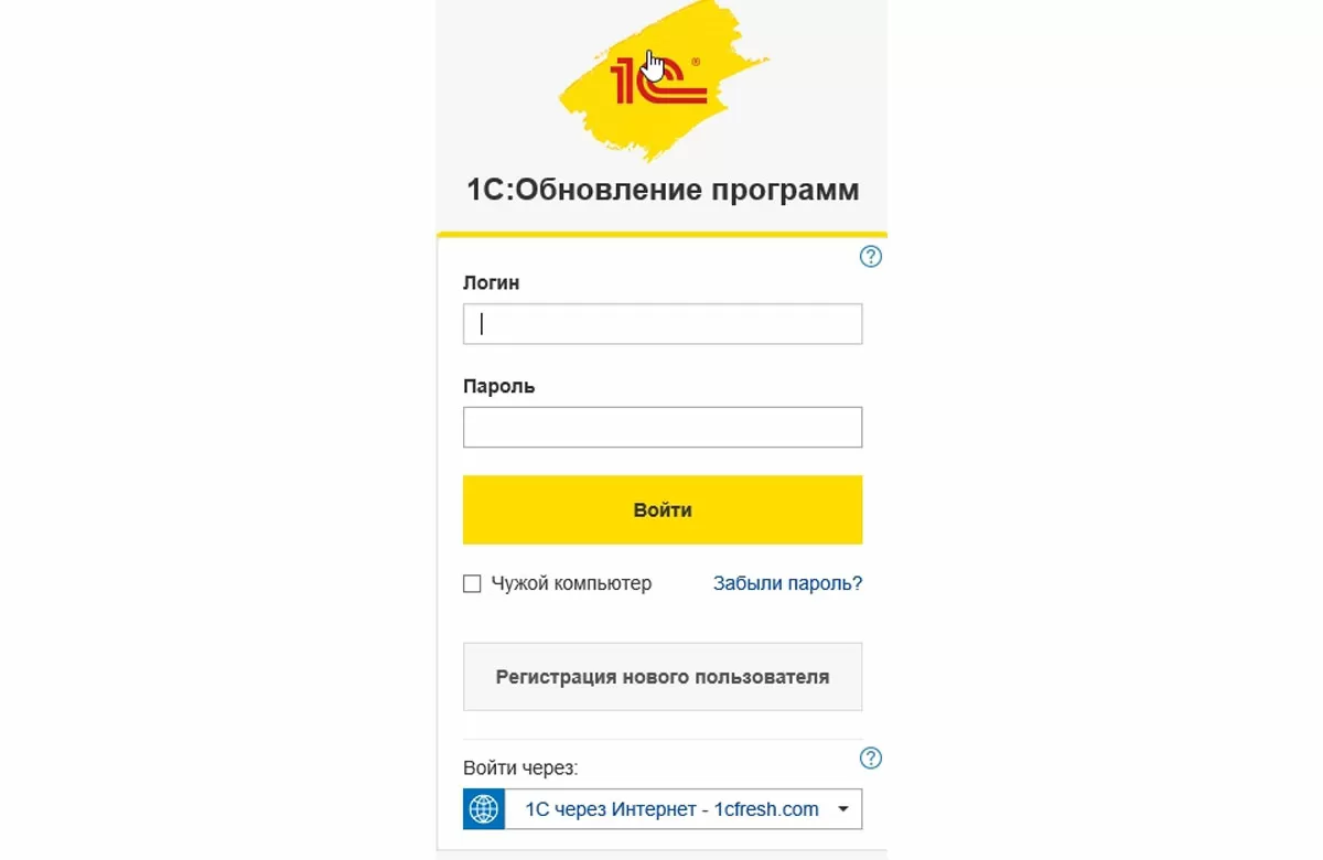 Далее нам необходимо понять на какой релиз мы можем обновить конфигурацию. Для этого заходим на сайт поддержки пользователей 1С (users.v8.1c.ru). У нас должен быть логин и пароль для сайта. Если нет, то в форме ввода логина и пароля присутствует кнопка «Регистрация нового пользователя».
