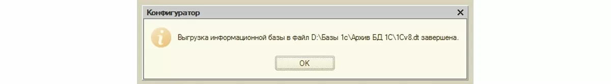 Как видим, и в процессе выгрузки, и в сообщении о ее завершении отображается путь, который мы указали. Надо учесть один нюанс: в процессе выгрузки, как и в процессе обновления, в БД кроме нас никого не должно находиться.