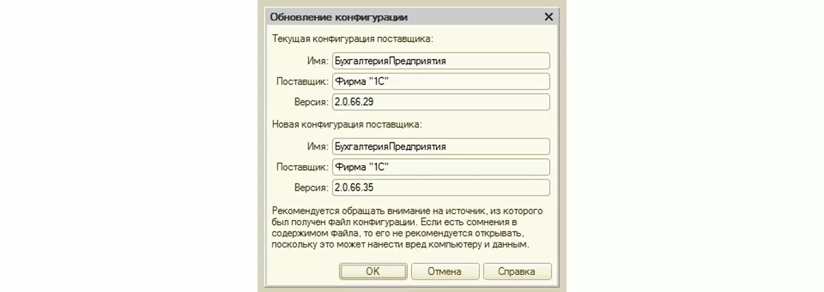 Программа предоставит краткую информацию о том, какая конфигурация обновляется, с какого релиза и на какой. Нажимаем «ОК».