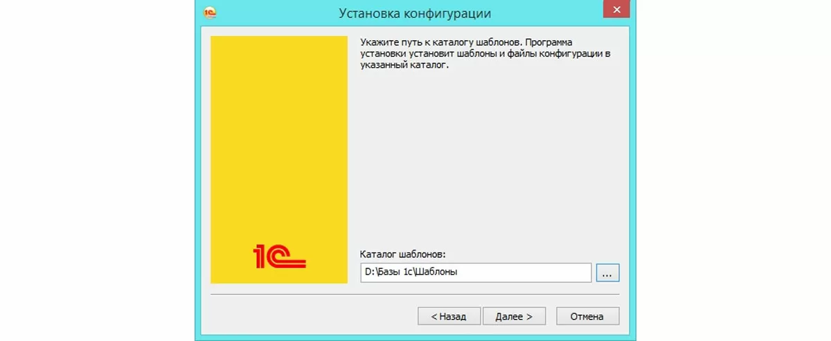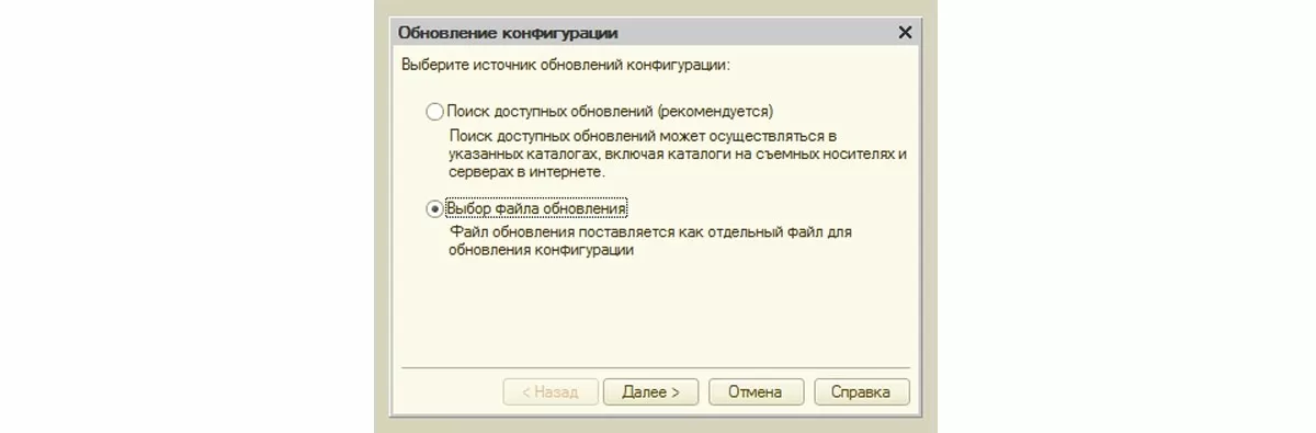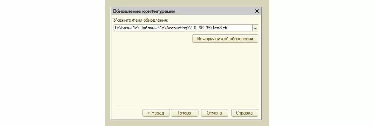 Программа предложит указать путь к файлу, содержащему обновление. Указываем путь к папке, куда установили шаблон, и в папке с шаблоном выбираем файл «1cv8.cfu». Жмем «Далее».
