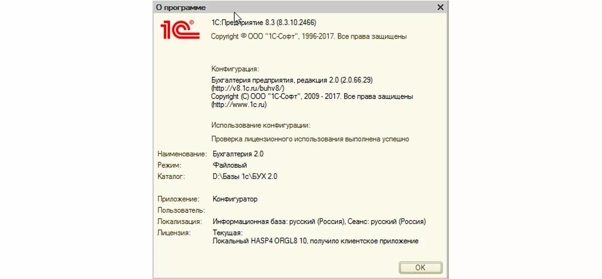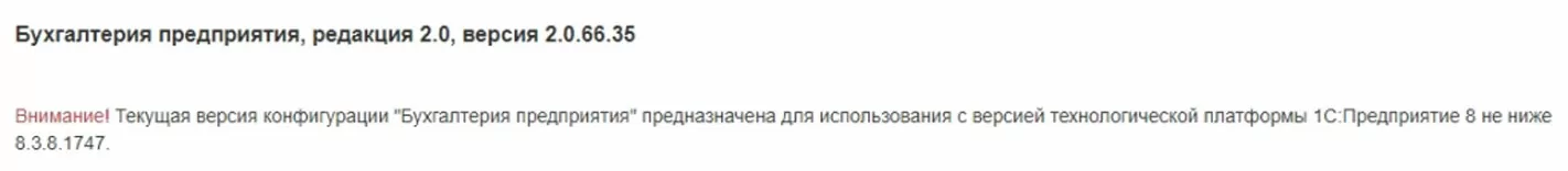В верхней части окна мы видим версию платформы 1С, на которой запущена наша конфигурация. Под ней – информация о конфигурации (название, редакция, номер релиза). Именно релиз конфигурации (указан в скобках) нам и нужен. Дело в том, что каждое обновление конфигурации 1С предназначено для определенных релизов.