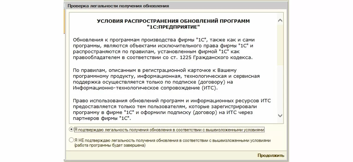 Выбираем «Я подтверждаю легальность получения обновления в соответствии с вышеизложенными условиями» (в противном случае обновление не будет завершено и программа закроется) и жмем «Продолжить».