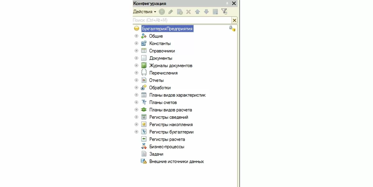 Приготовления закончены, а значит можно начать непосредственно обновление конфигурации БД. Переходим в главном меню. Нас интересует подменю «Конфигурация»-«Открыть конфигурацию». У нас открывается окно конфигурации следующего вида: