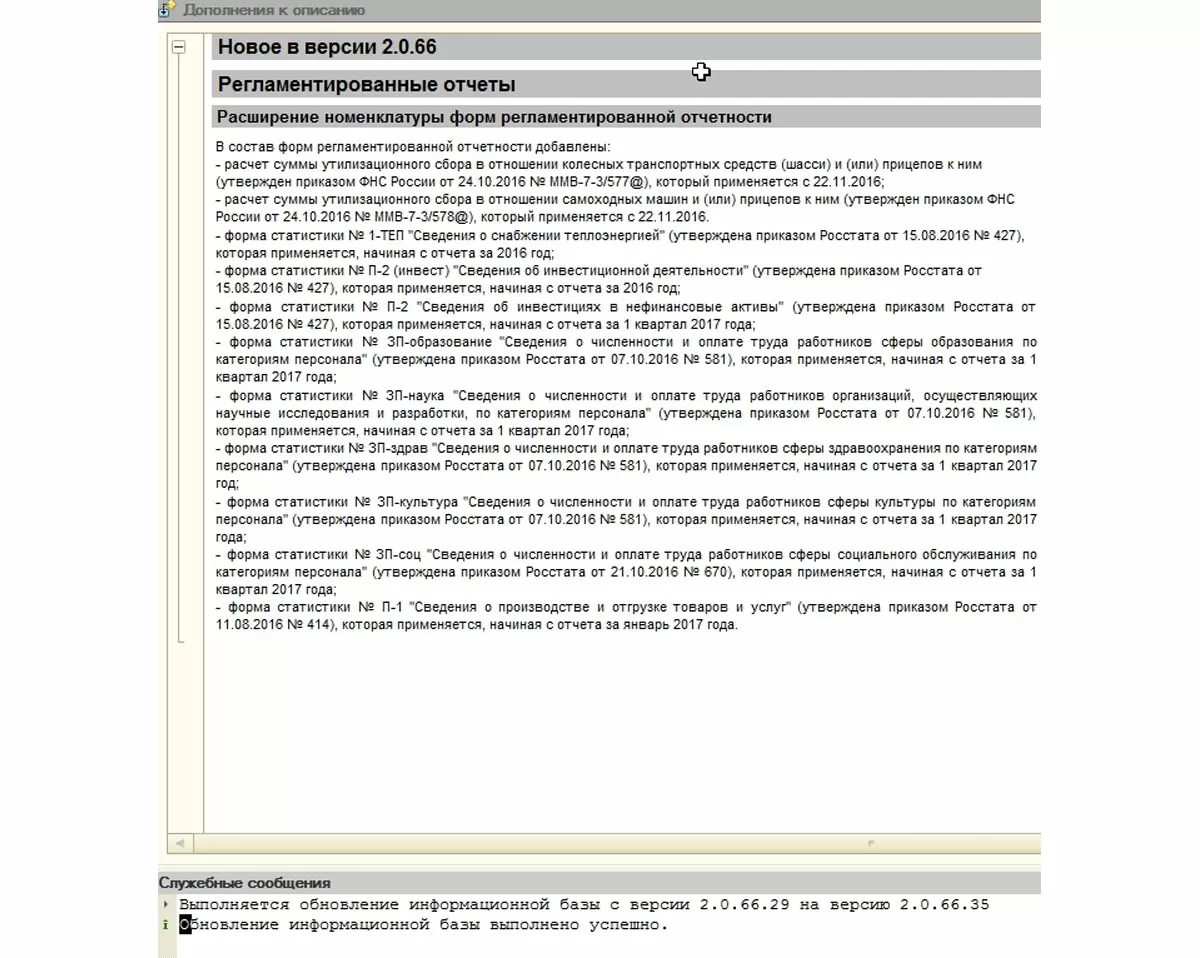 Ждем, пока внизу окна служебных сообщений появится надпись «Обновление информационной базы выполнено успешно». Это и будет означать успешное окончание процесса. Программа выдаст окно со списком изменений, которое можно изучить или сразу закрыть.