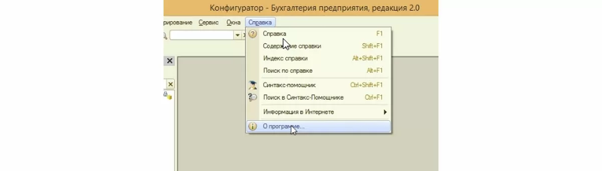 Итак, в первую очередь, для обновления конфигурации нам нужно понять, какой релиз конфигурации у нас установлен. Для этого нам необходимо запустить конфигурацию в любом режиме и в главном меню выбрать*: