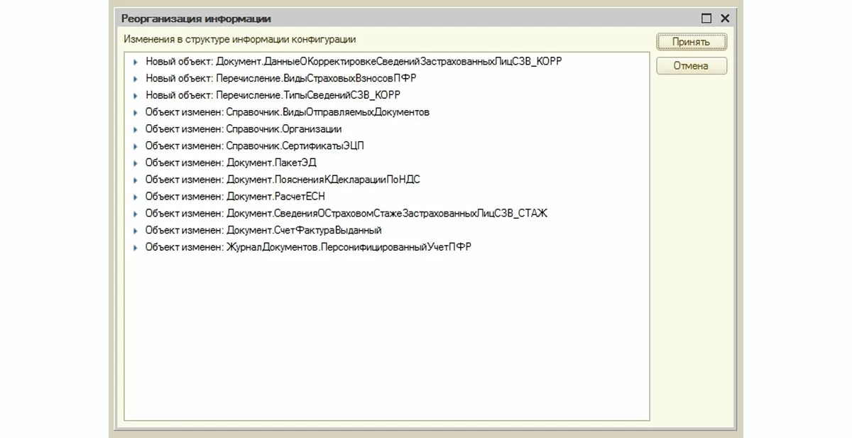 Программа покажет окно реорганизации информации. В нем отображена информация об изменении/добавлении объектов метаданных в процессе обновления.