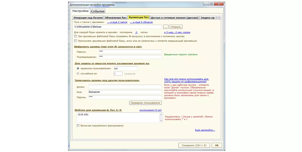 Программа умеет самостоятельно архивировать информационные базы в zip, dt, sql в зависимости от того, где она располагается, а также управлять количеством сохраненных резервных копий – автоматически удалит старые и оставит определенное количество последних сохранений.